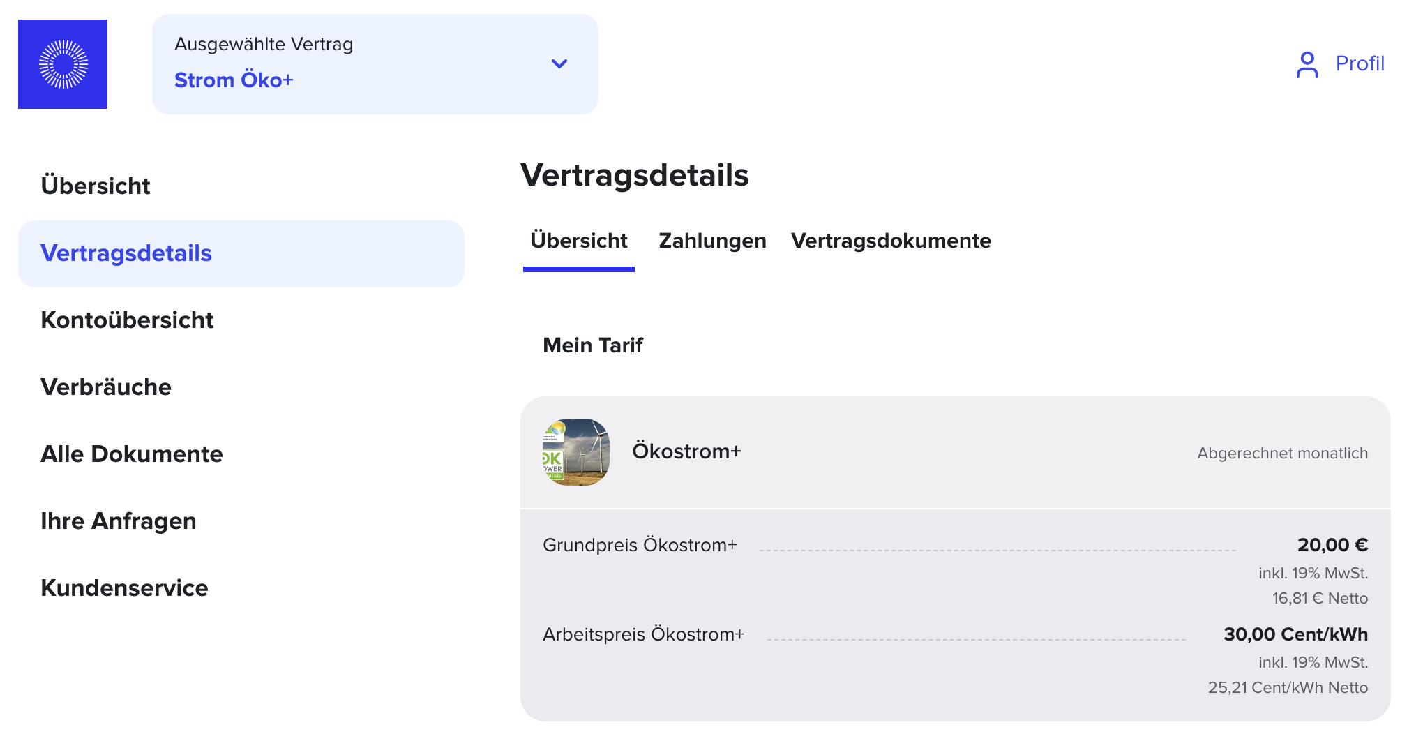- Dokumentenmanagement: Bereitstellung und Download von vertragsbezogenen Dokumenten, wie z.B. Rechnungen, zu jeder Zeit